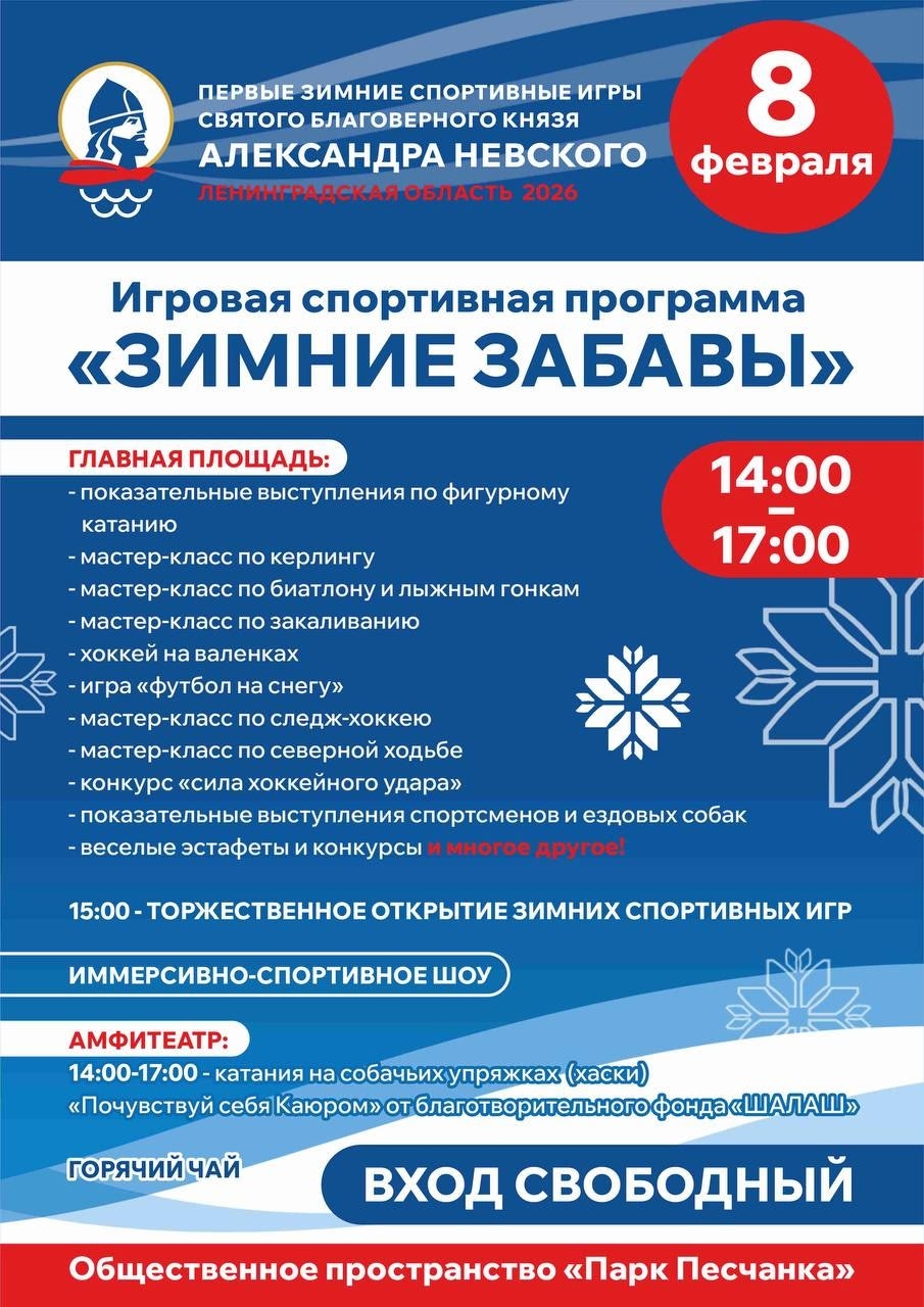 8 февраля приглашаем вас с 14:00 до 17:00 в парк "Песчанка" на игровую спортивную программу "Зимние забавы" в рамках первых зимних спортивных игр святого благоверного князя Александра Невского!
